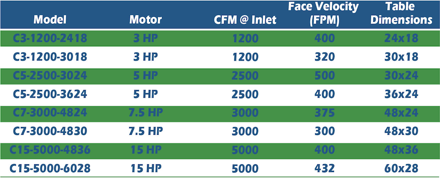Size Chart for SLR Wet Downdraft Tables